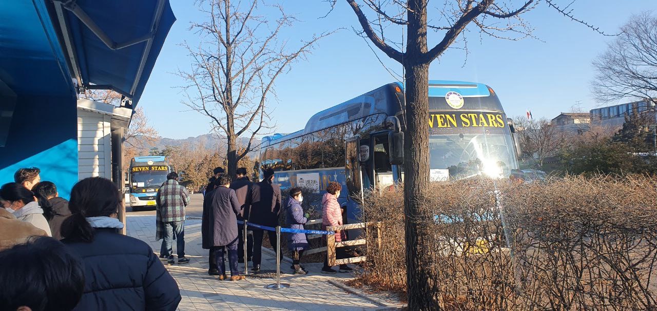 견학 당일이 되면 신청자는 경복궁 동문 주차장에 청와대 관람 만남의 장소라는 공간에서 모이고, 인원 수 확인, 신분 확인을 거쳐 청와대로 가는셔틀버스에 탑승합니다. 이 때 예약했던 시간보다 최소 10분 전에 도착하셔야 빨리 출발이 가능합니다. 지하철을 타고 간다면 3호선 경복궁역 5번 출구에서 약 7~10분 정도 걸으면 나옵니다.