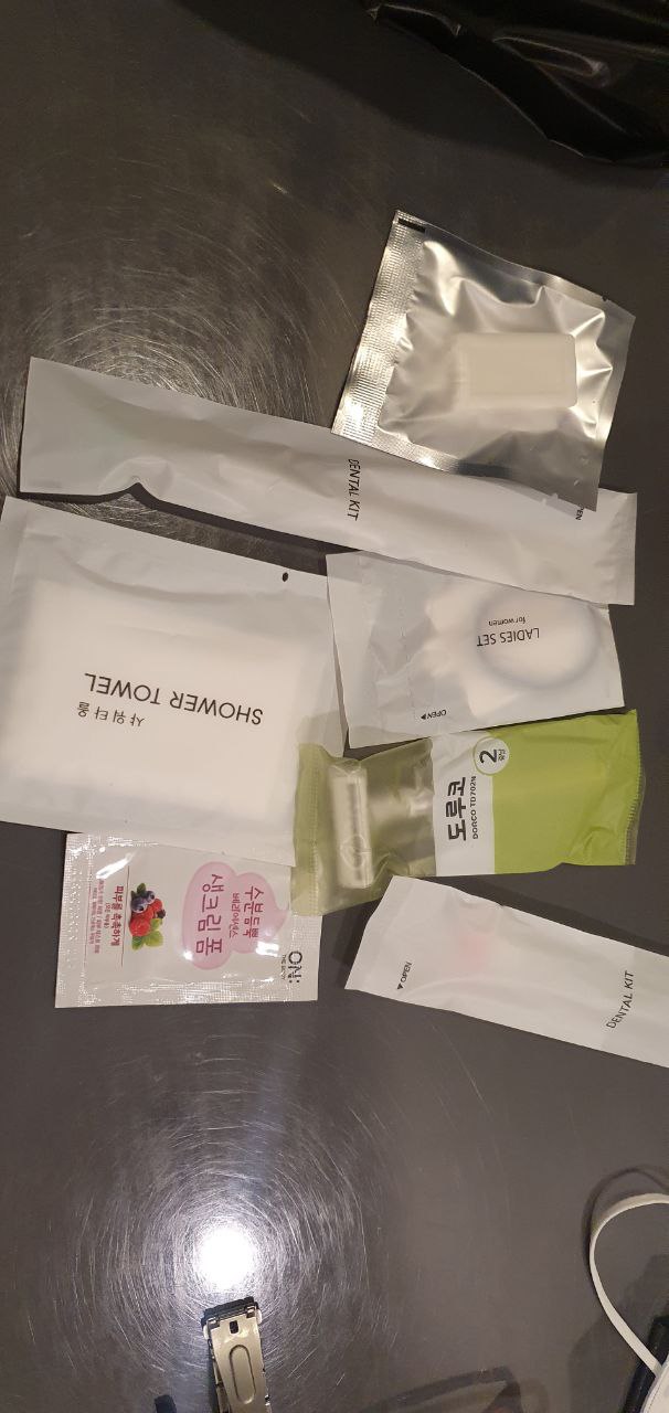 침대도 푹신푹신했고 기본적으로 전기장판이 설치되어 있어서 난방 걱정은 덜했습니다. 비품도 충분히 제공이 되었습니다. 사진상에서는 성인용제품은 제외한 비품만 모아서 찍었습니다.