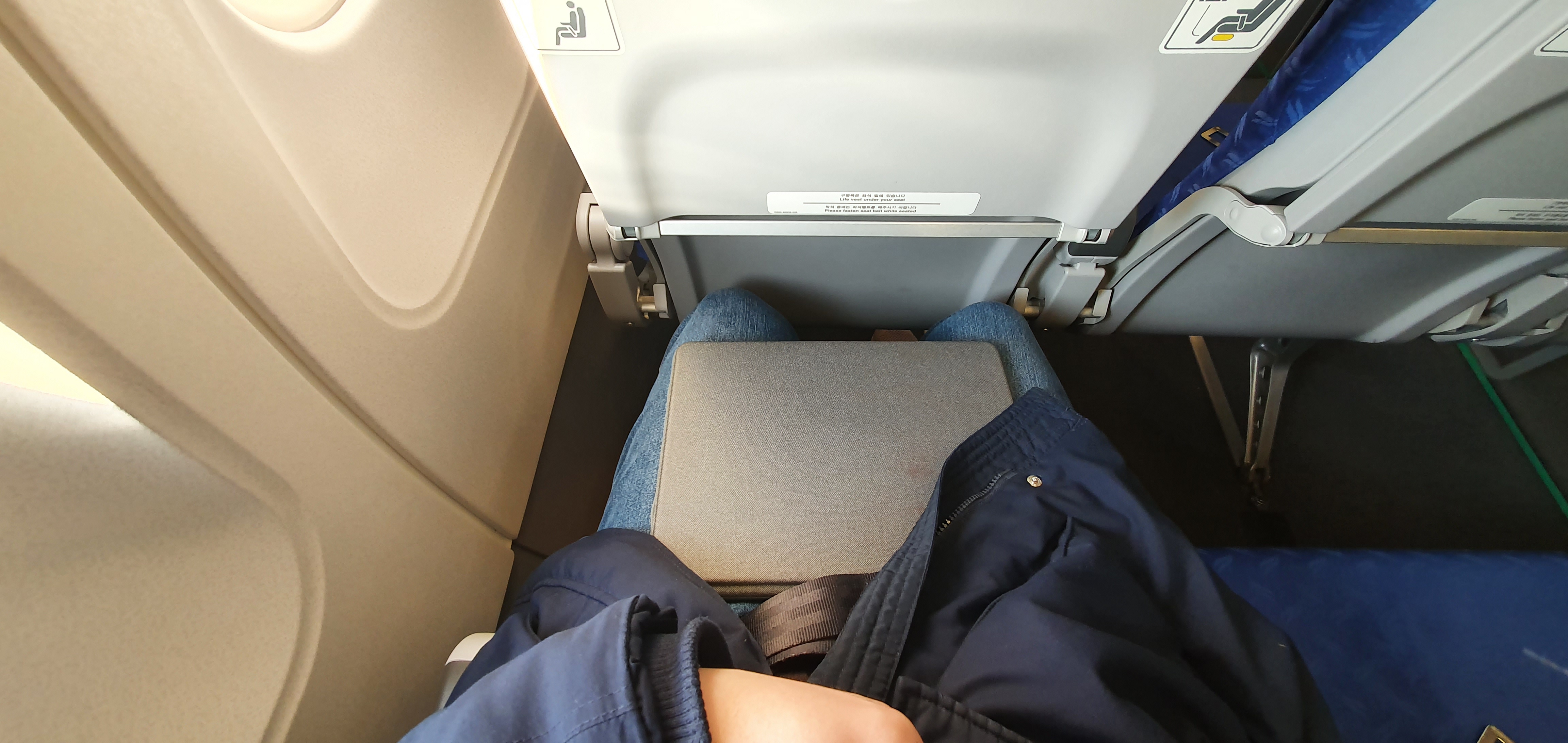 제 키가 딱 180인데 무릎이 닿을랑 말랑한 좌석 간격이었습니다. 이번 비행의 경우는 크게 난기류를 겪지 않고 50여분의 비행 끝에 바로 김포공항에 도착했습니다. 이렇게 이번 부산 급 여행 일정을 모두 마쳤습니다.