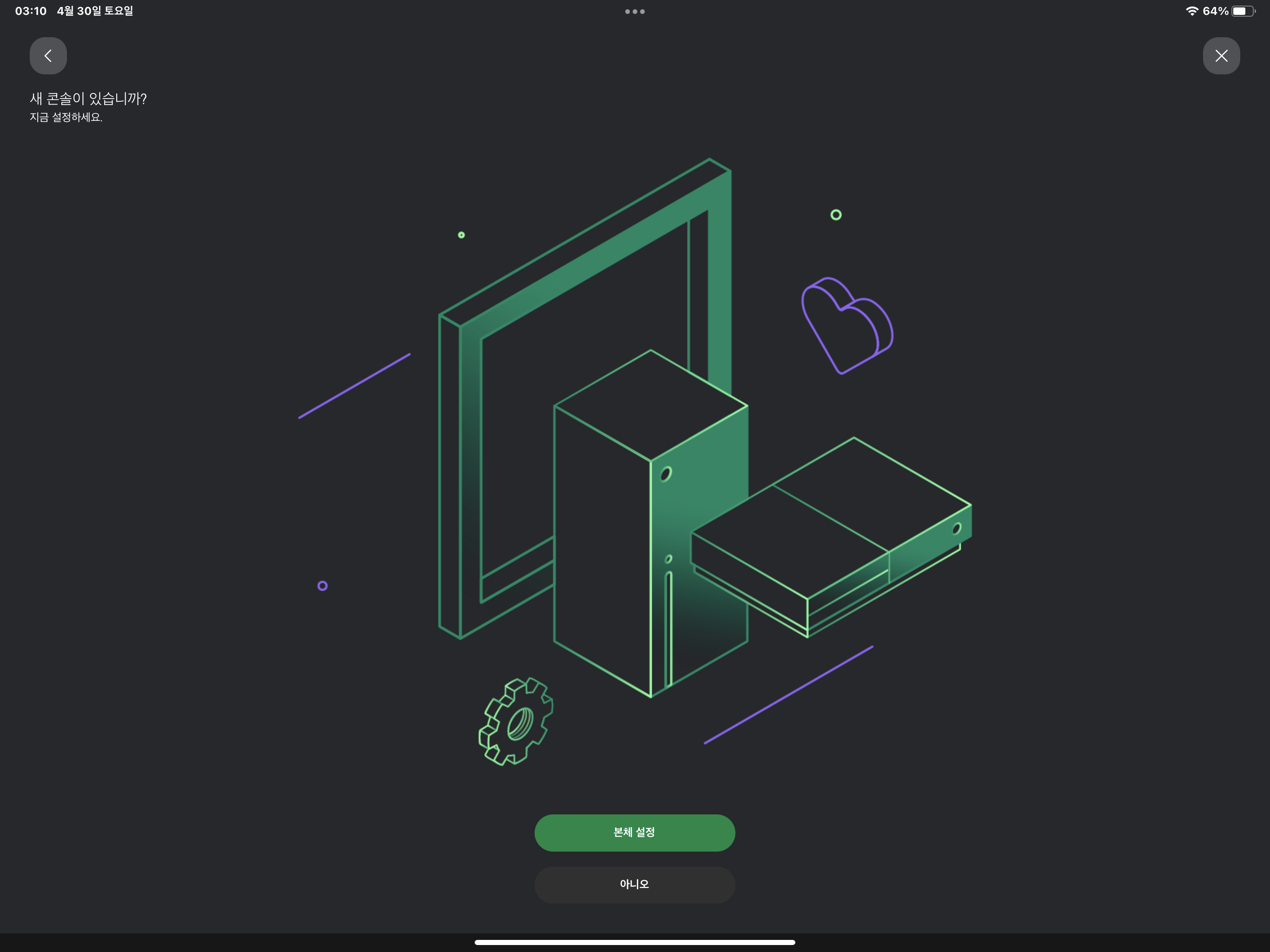 가지고 있는 스마트폰이나 태블릿PC를 통해 각각의 운영체제(안드로이드나 ios또는 ipad os)에서 엑스박스 앱을 설치를 한 후 화면에 보이는코드를 앱에서 입력을 하면 기기를 통해 콘솔 초기 설정을 진행 할 수 있습니다.
