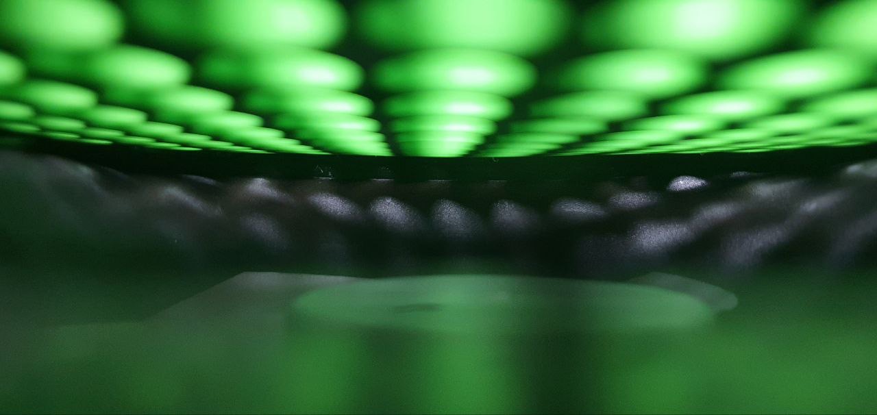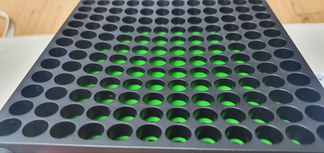 위에서 보면 이렇게 공기가 빠져나갈 수 있는 환풍구가 있습니다. 환풍구 구멍 두께부분에 녹색으로 칠해져 있는데 이게 조명이 환풍구를 통해 안쪽 팬으로 들어오면 녹색 빛이 도는게 상당히 인상적입니다. 그리고 윗면은 안쪽으로 파여진 형태입니다.