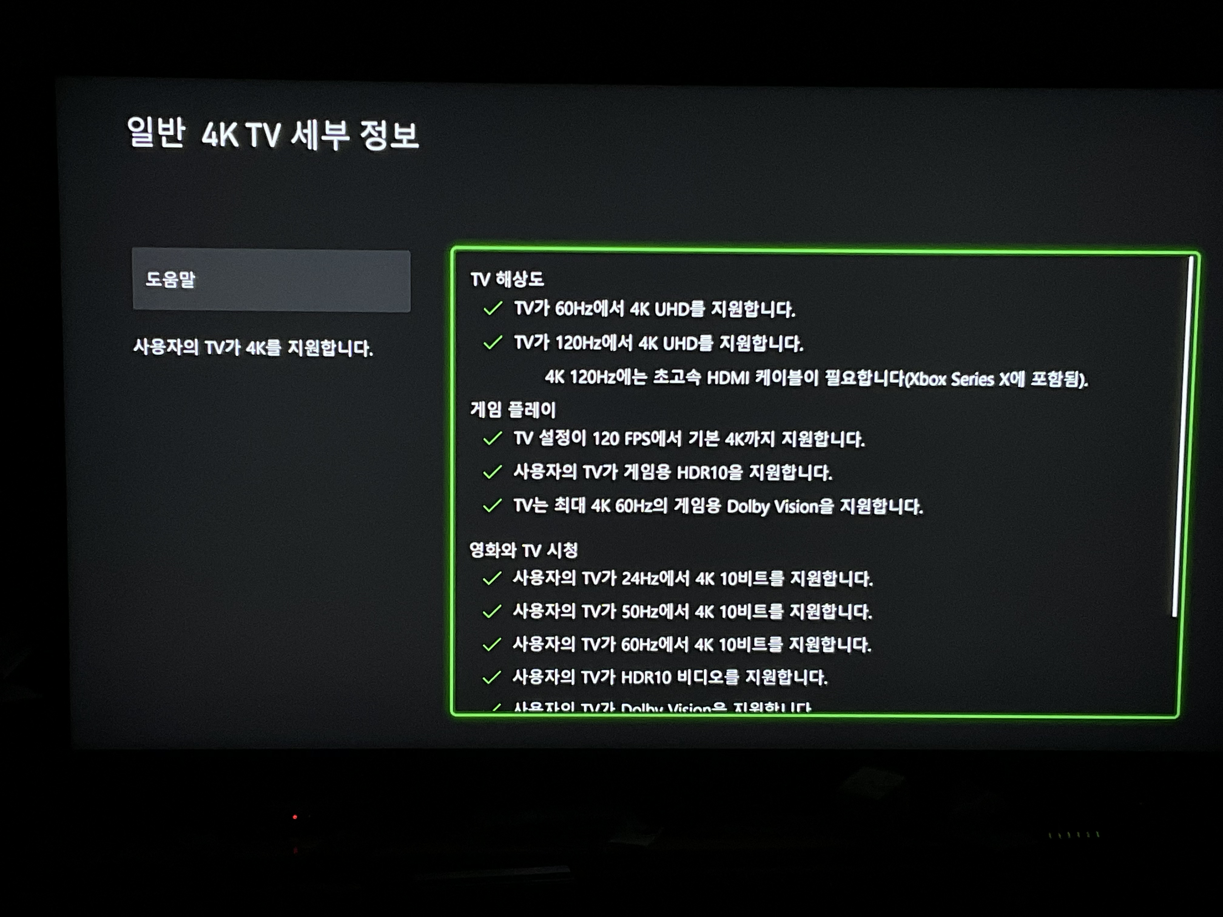 사용자가 사용하는 TV의 해상도는 어느 정도인지, HDR은 지원하는지, HDMI2.1을 지원하는지 등등을 파악해서 알려줍니다.