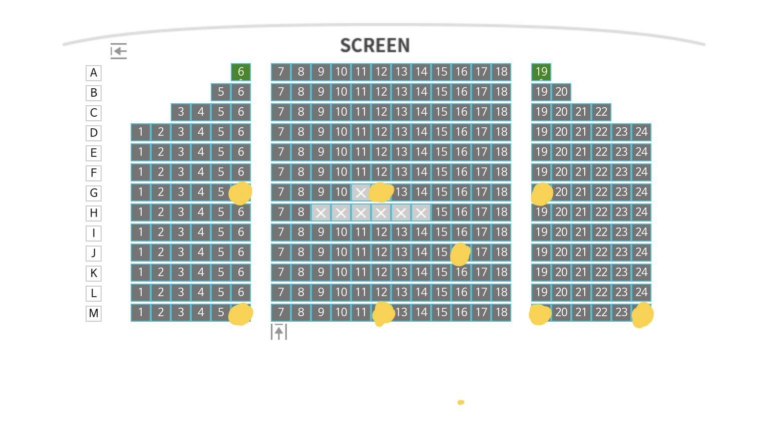 스크린이 꽤 크다보니 앞쪽 좌석은 위로 올려다 봐야 하는 수준입니다. 맨 앞줄은 용아맥의 A열과 비슷한 수준입니다. 시선 일치는 적어도 G열부터라고 생각하시면 됩니다. 중앙 좌석은 12,13번 사이가 가운데입니다.