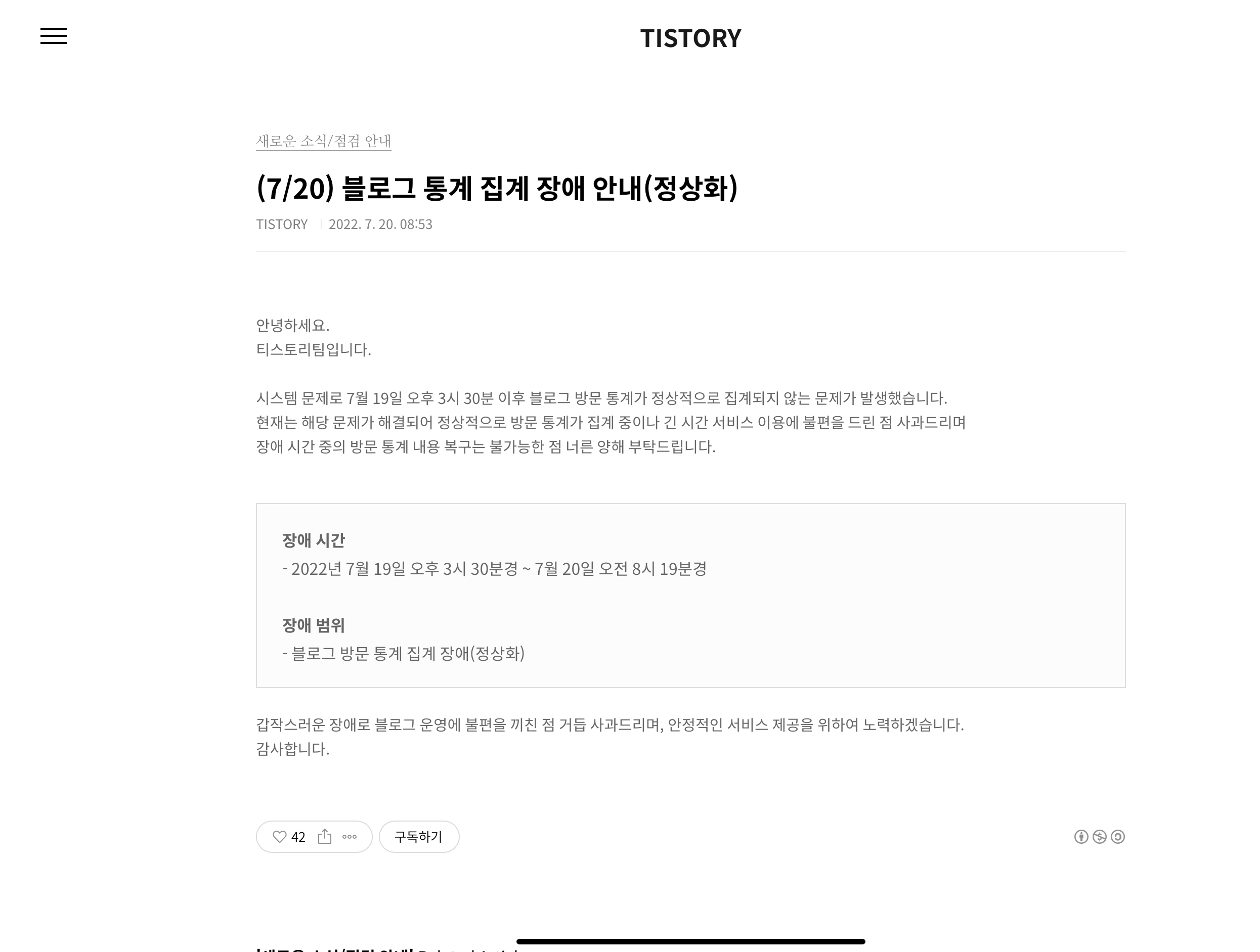 티스토리팀에서 공식적으로 밝히고 있는 사항은 지난 7월 19일 오후 3시 30분경부터 7월 20일 오전 8시 19분경까지 블로그방문 통계 집계에 장애가 있었다가 정상화되었다는 것입니다.