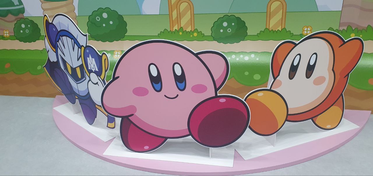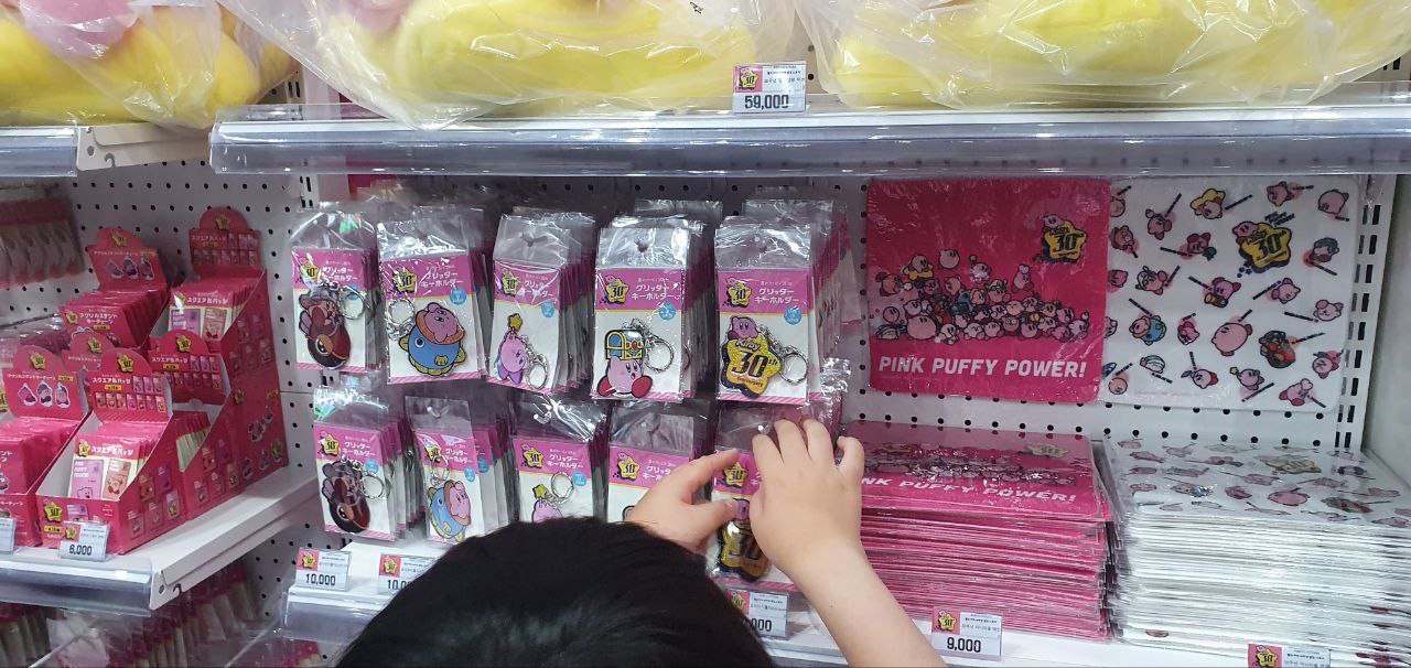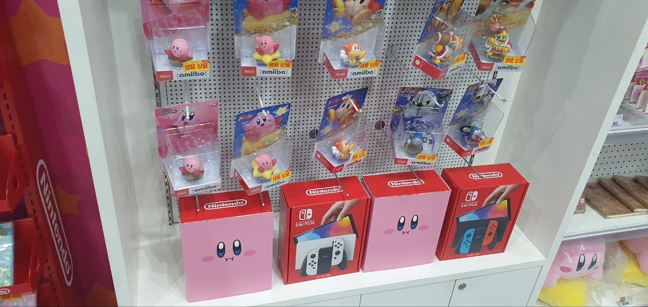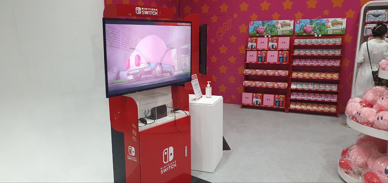 단순 굿즈 판매 뿐만 아니라 이번에 출시된 신작, 디스커버리의 데모 플레이도 가능하고, 게임도 직접 판매중이며, 스위치 본체도 판매 중입니다. 닌텐도 스위치 OLED 패키지 겉에 커비 이미지 패키지가 동봉되어 있는 것을 볼 수 있습니다.
