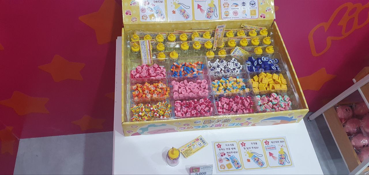미니지우개의 경우 저 유리통 안에 자기가 원하는 만큼 다양한 종류의 지우개를 담는 방식으로 판매중이며 저 유리병 단위로 유리병 1개에 5000원으로 판매되고 있습니다.