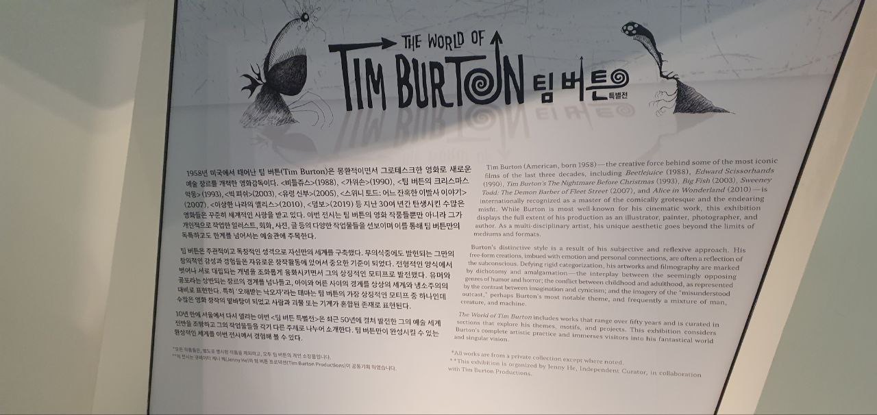 10년 전에도 팀 버튼 전시회를 갔었는데 너무 오래전이라 전시 내용이 많이 기억이 나지 않았습니다. 그 때는 팀 버튼 감독의 일대기적 구성으로그림이 전시 된 걸로 기억을 하는데 이번 전시회 The World of TimBurton은 커리어를 쌓기 시작한 대학교 시절 이후부터 지금까지의 작품 활동을 중심으로 작품이나 팀 버튼 감독의 개인 소장품들이 전시되어 있습니다. 디즈니 작품들과 여러 실사 영화들의 컨셉 아트와 모형, 인형들과 후반부에 티슈에 그린 낙서들, 그리고 마지막엔 팀 버튼 감독의 작업실을 재현한 전시까지 있었습니다. 전시장 중간에 그의 짧은 단편 애니메이션이나 영상 작품의 일부 장면들 역시 재생되고 있었습니다. 다만 방학시기라 그런지 금요일 오후임에도 사람들이 꽤나 많아 굴소년의 우울한 죽음 정도밖에 제대로 감상하지 못했습니다. 저는 전시를 보는데 1시간 정도 걸렸는데, 전시장에서 재생되는 영상들까지 제대로 감상한다면 넉넉잡아 2시간 이상의 시간이 걸릴 것 같았습니다.