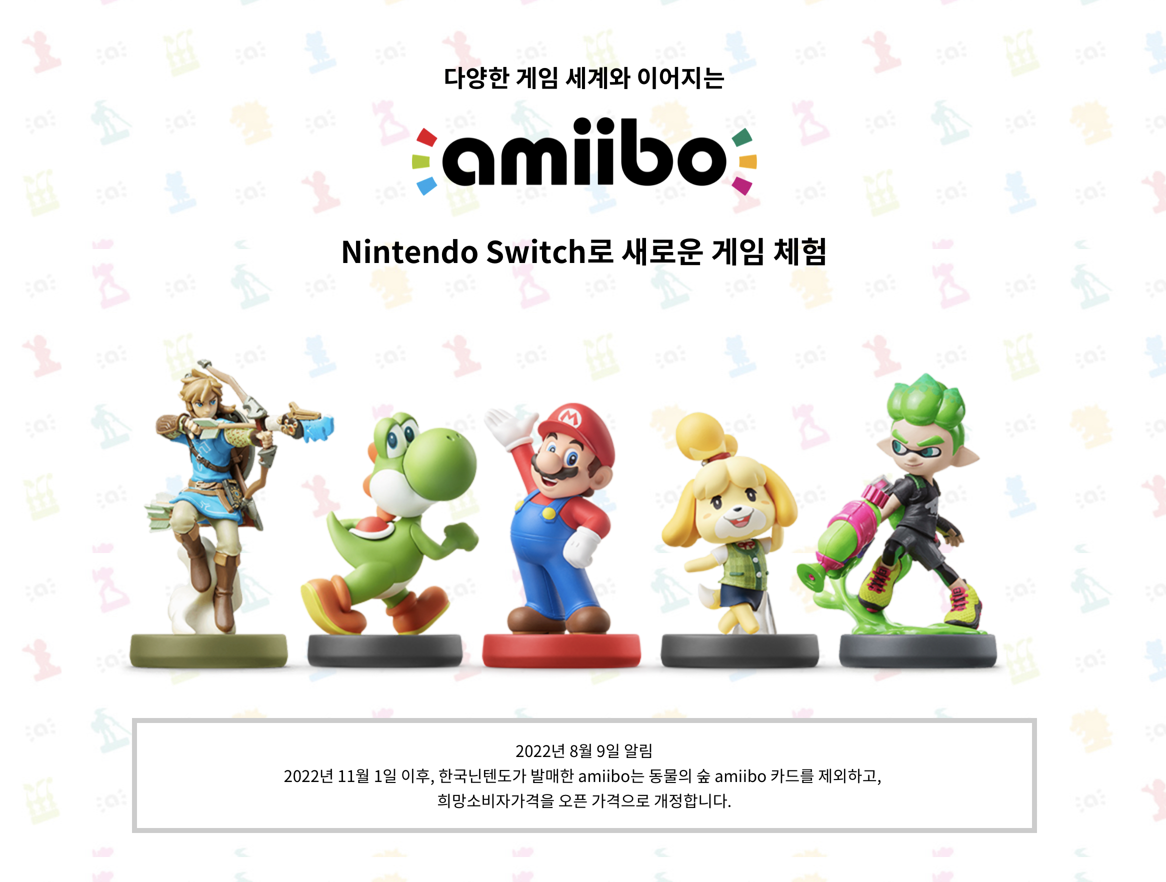 한국과 일본 닌텐도에서 지난 2022년 8월 9일 공지가 발표되었습니다. 내용은 올 해 11월 1일부터 한국과 일본 닌텐도에서 발매한 아미보가 희망소비자가격을 오픈 가격으로 개정한다는 것입니다.