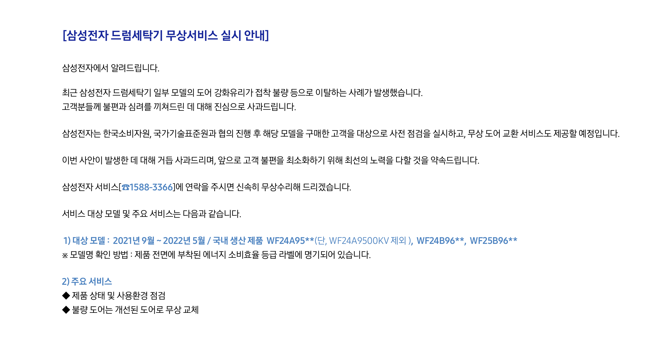 2022/08/18 삼성전자 드럼세탁기 무상서비스 실시 안내문 게시정보 2022. 8. 19. 00:08반응형