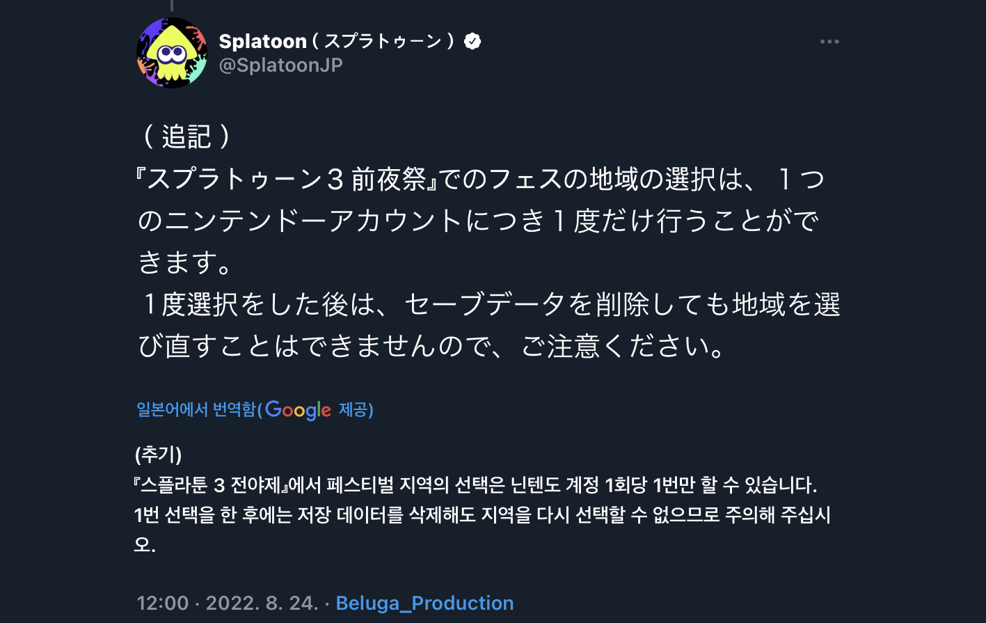 이미지 출처 : 일본 스플래툰 공식 트위터 계정 그리고 오늘 또 추가로 나온 정보로는 이번 전야제 페스티벌에선 닌텐도 계정 1회당 1번만 선택이 가능하다고 하며, 선택한 이후에는 스플래툰3 전야제 관련 데이터를 삭제해도 지역 변경이 불가하다고 합니다.